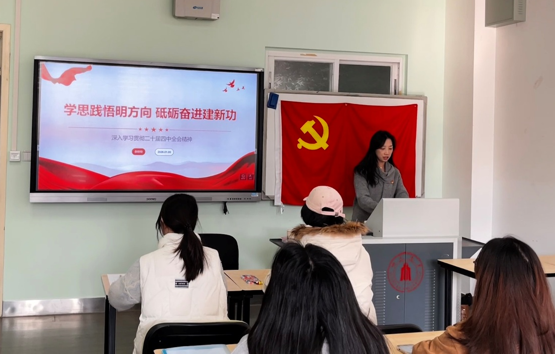 为深入学习贯彻党的二十届四中全会精神,引导学生党员将个人发展融入国家发展大局,本科生第二党支部于2026年1月9日组织开展了专题党课学习活动。党支部书记余昕玲老师以《学思践悟明方向,砥砺奋进建新功——深入学习党的二十届四中全会精神》为题,为支部全体党员讲党课。