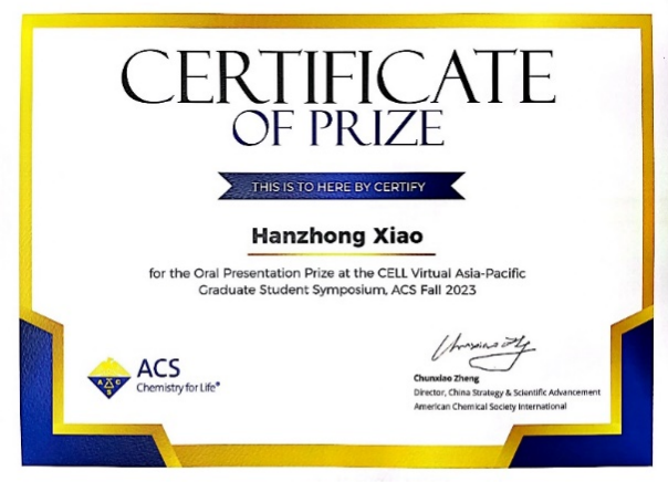 2023年8月13-17日,由美国化学会举办的ACS 2023秋季年会在美国旧金山以线上、线下结合的方式顺利召开。bw必威西汉姆联官网石碧院士课题组黄鑫研究员指导的2021级博士研究生肖涵中在亚太纤维素和再生材料学生分会场做口头报告,并获得优秀报告奖。