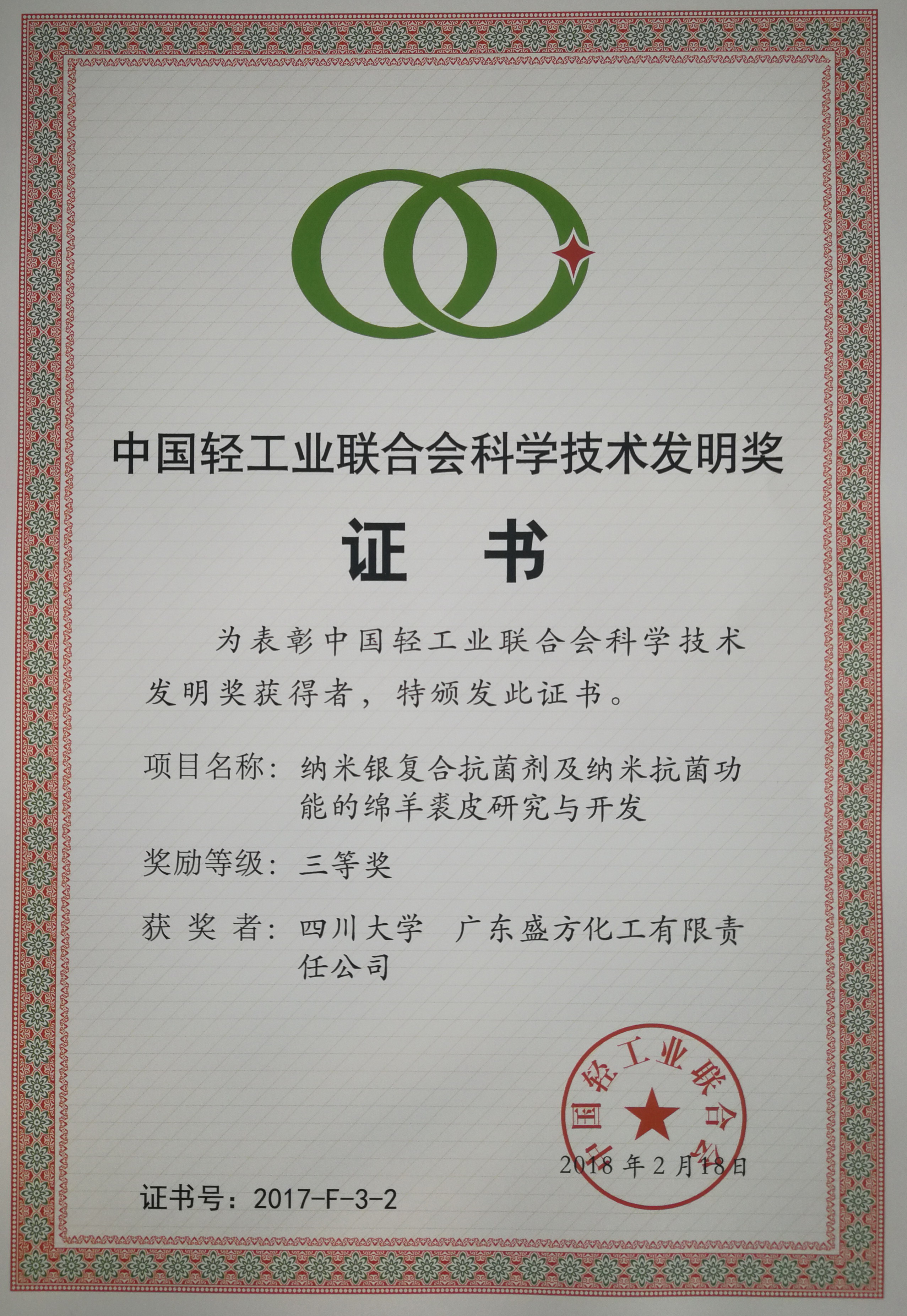 中国轻工业联合会于3月20日在山西太原举行2017年度中国轻工业联合会科学技术奖颁奖典礼。由四川大学陈武勇、周晋、张金伟、杨威特和王瑶,广东盛方化工有限责任公司孙宏斌等完成的 “纳米银复合抗菌剂及纳米抗菌功能的绵羊裘皮研究与开发”荣获中国轻工业联合会科学技术发明奖三等奖。中国轻工业联合会科学技术奖延续原轻工业部科技奖,属于可推荐国家级奖励的省部级奖,奖项与国家级奖一致,设科学技术发明奖和科学技术进步奖,每年评奖一次,奖励对我国轻工业科技进步、经济社会发展、轻工业行业现代化建设做出较大贡献的科学技术人员和组织。其奖励范围与bw必威西汉姆联官网的皮革、食品、发酵等专业或专业方向密切相关,2018年中国轻工业联合会科学技术奖励工作将在4月份启动。