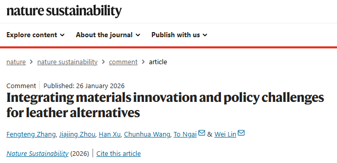 2026年1月26日,bw必威西汉姆联官网林炜教授对生物基皮革替代品(类皮革材料)面临的挑战和机遇进行了评述,相关论文以Integrating Materials Innovation and Policy Challenges for Leather Alternatives为题,发表于Nature Sustainability。文章系统介绍了生物基皮革替代品的材料组成及制备方法,深入分析了这类新型材料在产品性能和制造方面所面临的问题。文章最后探讨了生物基皮革替代品在开发和应用中的挑战,指出了潜在的研究方向,旨在为创新材料的研发提供参考。