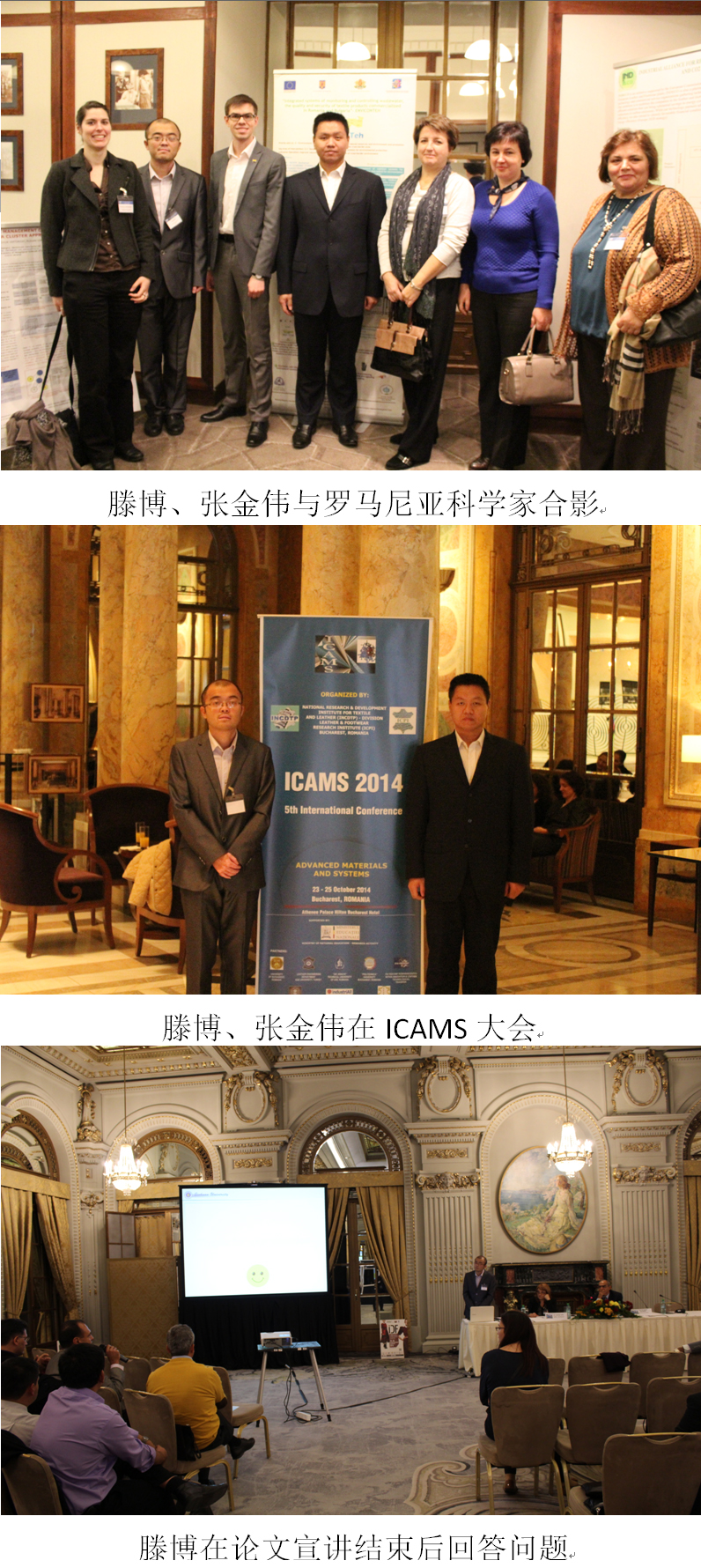 2014年10月22日至10月29日,bw必威西汉姆联官网陈武勇教授课题组博士研究生滕博,硕士研究生张金伟参加了由罗马尼亚国家皮革与纺织品发展研究院、布加勒斯特制革与制鞋研究中心以及罗马尼亚教育部主办的第五届先进材料与系统国际会议(5thICAMS)。并以大会宣讲及海报展示的方式展出研究论文4篇。