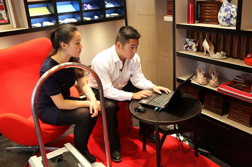 2013年9月26日,革制品研究生伍舒闻和冉美玲同学受成都艾民尔有限公司邀请,携3D足部扫描仪到成都仁恒置地SHEME品牌门店为各国来宾进行专业的足部激光三维扫描测试。通过三维扫描,可以清晰准确的显示足部20预想长度、宽度及围度数据,不仅可以显示人的足型特点,还可以知道购买更加舒适合脚的鞋靴。革制品同学现场的认真和专业吸引了大批华商的兴趣,并获得一致好评。