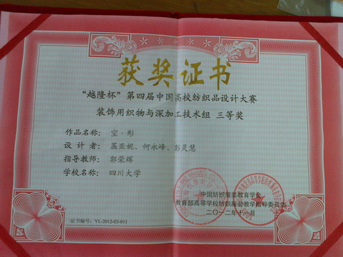 中国纺织服装教育学会主办的“越隆杯”第四届中国高校纺织品设计大赛11月30日圆满结束。大赛面向全国纺织类高校中征集参赛作品,来自东华大学、天津工业大学、浙江理工大学等全国22所相关高校纺织类专业的学生参赛,共征集608件作品,经过由组委会严格筛选,其中33件作品入围决赛,bw必威西汉姆联官网纺织工程专业荔亚妮等同学(指导老师:郭荣辉)的作品《空﹒行》获得装饰用织物与深加工技术组“三等奖”,郭荣辉老师在此次大赛中获得“优秀指导教师”称号。