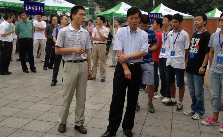 党委书记杨泉明教授向迎新值班老师了解迎新接待情况