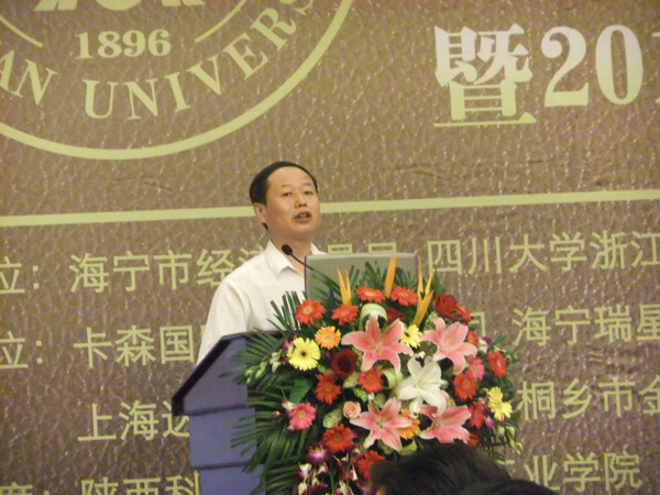 轻纺与食品学院何有节副院长代表学院和皮革工程系在皮革校友会成立大会上致辞,对校友会的成立表示祝贺。何有节介绍了皮革系近年来的科研、教学等各方面的发展情况,对校友们在学生实习就业、奖学金设立、资助学生、开设讲座、建言献策等方面对学校、皮革系的大力支持表示了感谢。 由海宁市经贸局举办的主题为“绿色环保,可持续发展”的2010海宁皮革论坛与校友会成立大会结合举行。 在论坛会上,中国工程院院士石碧教授以及皮革行业相关协会及企业的国内外代表围绕目前我国制革行业的发展现状及迫切需要解决的问题展开了交流,专家们在会上做了精彩深刻的主题报告,为与会的校友带来了我国皮革行业的前沿信息。石碧教授针对我国皮革行业近十年来制革污染物的治理技术的现状,以及目前制革企业关注的废水、废弃物及污泥治理技术的发展,提出了源头控制污染、循环利用废液、固废资源化利用与无害化处置链接集成的制革产业循环经济技术模式,指出制革工业园区发展模式的优势。