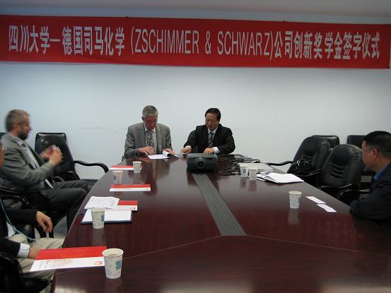 2008年3月28日,司马化学(ZSCHIMMER & SCHWARZ)有限公司在四川大学设立“四川大学—德国司马创新奖学金”签字仪式在四川大学皮革工程系隆重举行,司马化学(ZSCHIMMER & SCHMWARZ)有限公司应用部技术经理Mr.Neumeier和轻纺与食品学院副院长何有节教授分别代表校企双方在协议上签字。参加签字仪式的领导有轻纺与食品学院党委书记刘学文教授、司马公司研发部经理Dr.Francke、司马首席代表、皮革部中国区张建华经理、皮革部技术代表宋在健先生、皮革系副主任彭必雨教授、团委书记冯国涛老师等。 据悉,这个奖学金是企业首次为四川大学大三大四本科生进行科研创新实践而设立的。