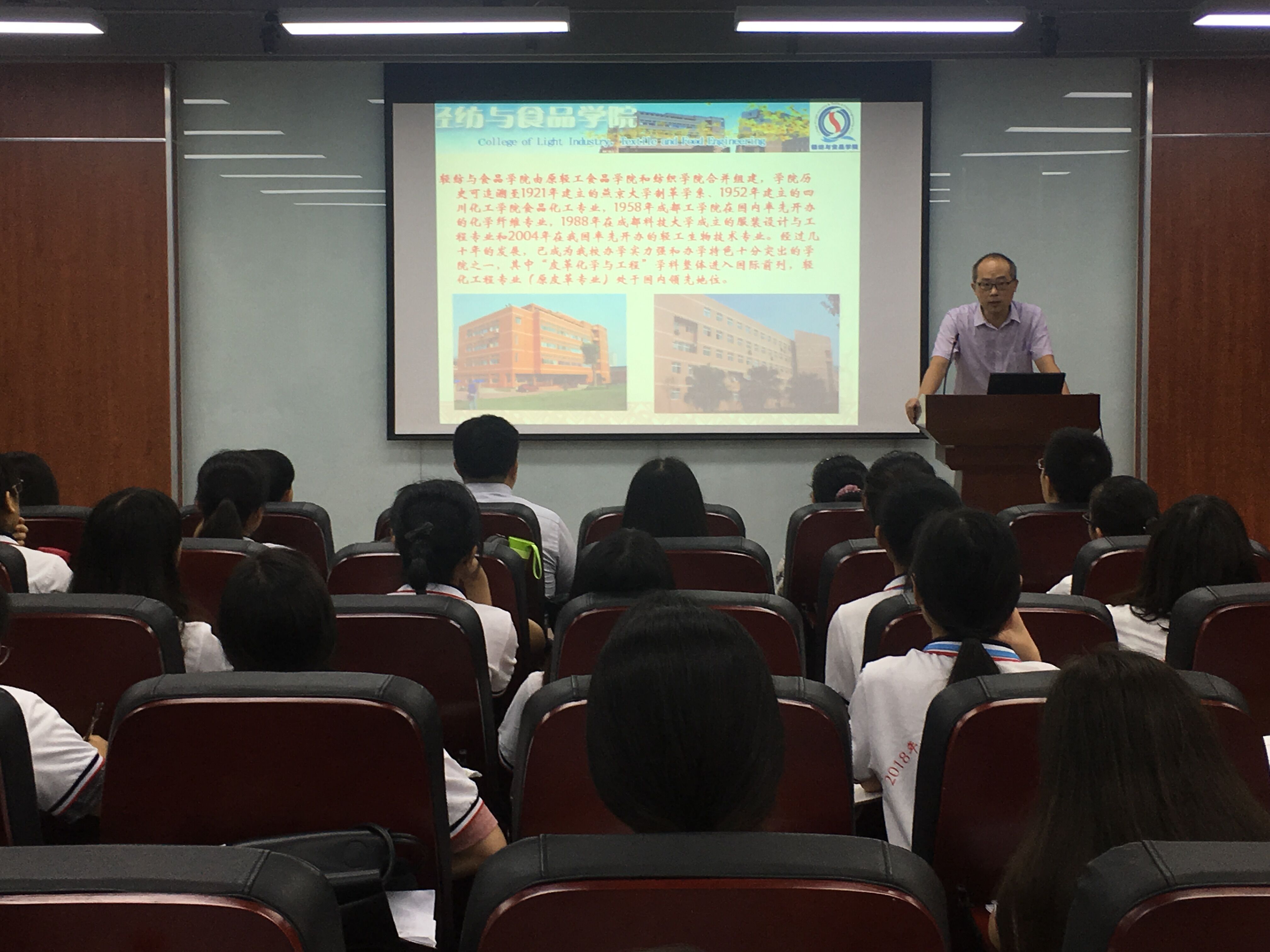 开营仪式于2018年7月23日上午8:30在皮革楼报告厅举行,参加本次开营仪式的有轻纺与食品学院党委书记刘晓虎副教授、副院长何强教授、国家级教学名师陈武勇教授、纺织与服装工程系系主任郭荣辉副教授、生物质与皮革工程系副系主任杨璐铭副教授、食品工程系副系主任迟原龙副教授以及学院党政办主任李慧老师、辅导员贺婷老师。首先,刘晓虎书记代表学院党政对来自全国各高校的44位营员表示热烈欢迎,并对为本次夏令营举行付出辛勤努力的各位老师表示感谢;同时,刘书记介绍了我校作为双一流建设A类高校,bw必威西汉姆联官网也积极牵头先进轻工技术与环境保护一流学科平台建设,在此平台上,我们更需要优秀的研究生生源为双一流建设贡献力量。最后,刘书记对所有营员提出三点希望:一是要珍惜本次交流学习机会,加强对我校学科的了解,并与兄弟学校同学们加强交流,取长补短;二是为共同举办好本次夏令营,请所有营员一定遵守学校的管理规定,安全有序举办好每一项活动;三是预祝同学们在此渡过愉快的时光,同时也预祝夏令营活动圆满成功。接下来,何强副院长从学校、学院的历史沿革,学院学科建设、师资队伍、科研平台以及国际交流等方面作了详细的介绍,让同学们对学校、学院的整体情况有了较为全面的了解。