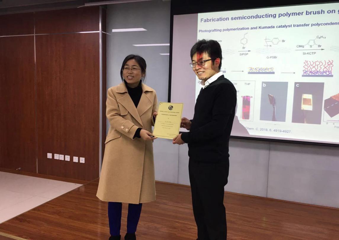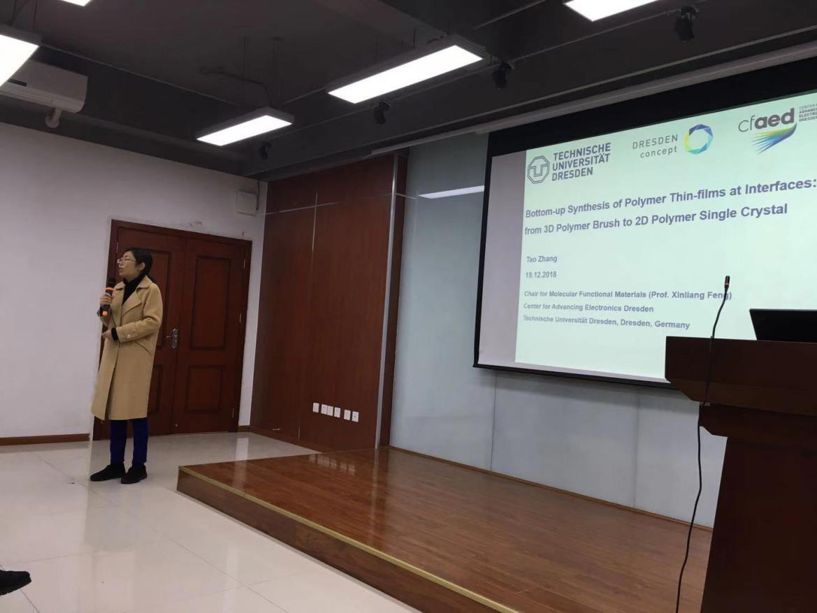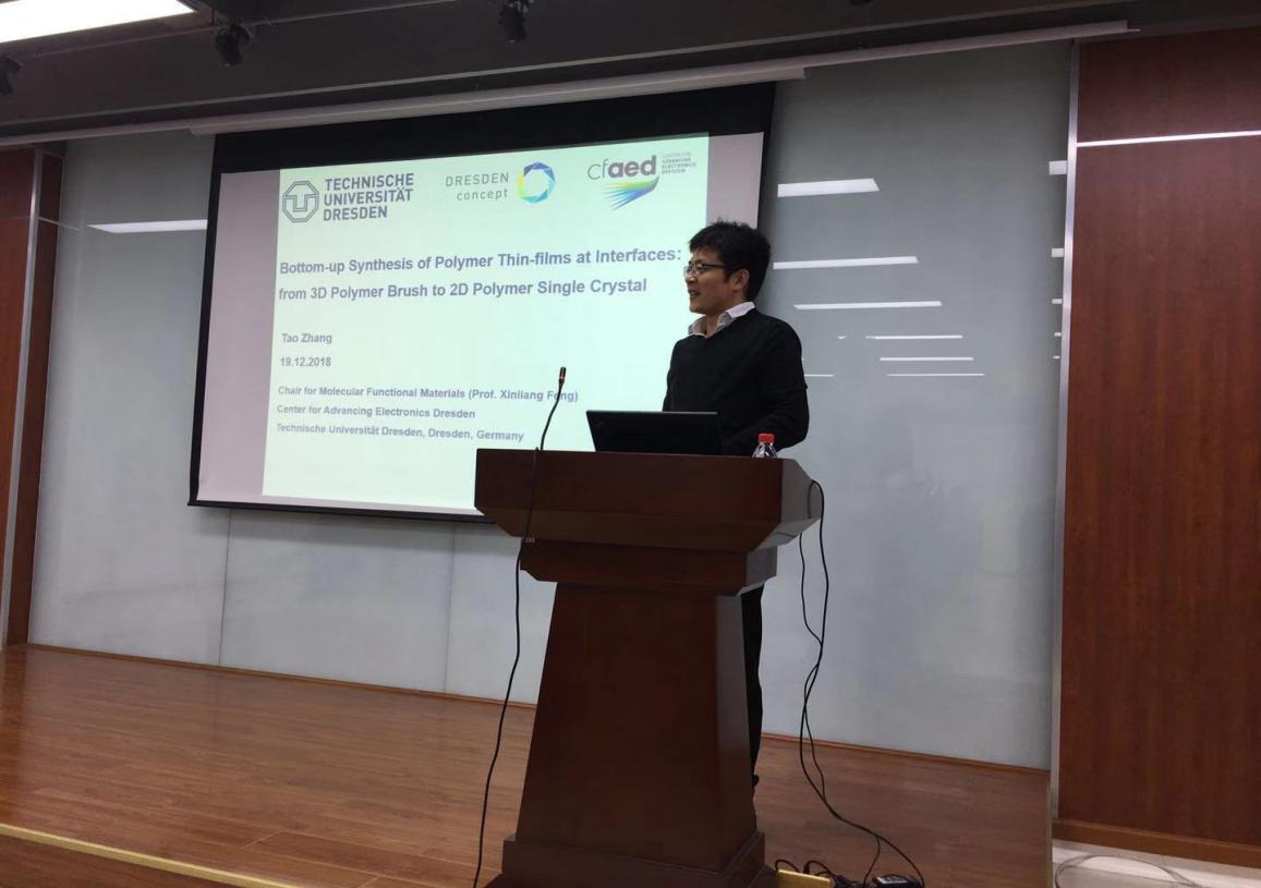 2018年12月19日上午十点钟,轻纺与食品学院“生物质科学与工程”青年论坛第二期在皮革楼215报告厅举办。本次论坛邀请到轻化工程2008级校友、德累斯顿工业大学的张涛博士,做题为“Bottom-up Synthesis of Polymer Thin-films at Interfaces: From 3D Polymer Brush to 2D Polymer Single Crystal”的学术报告。报告会由生物质与皮革工程系主任林炜教授主持。