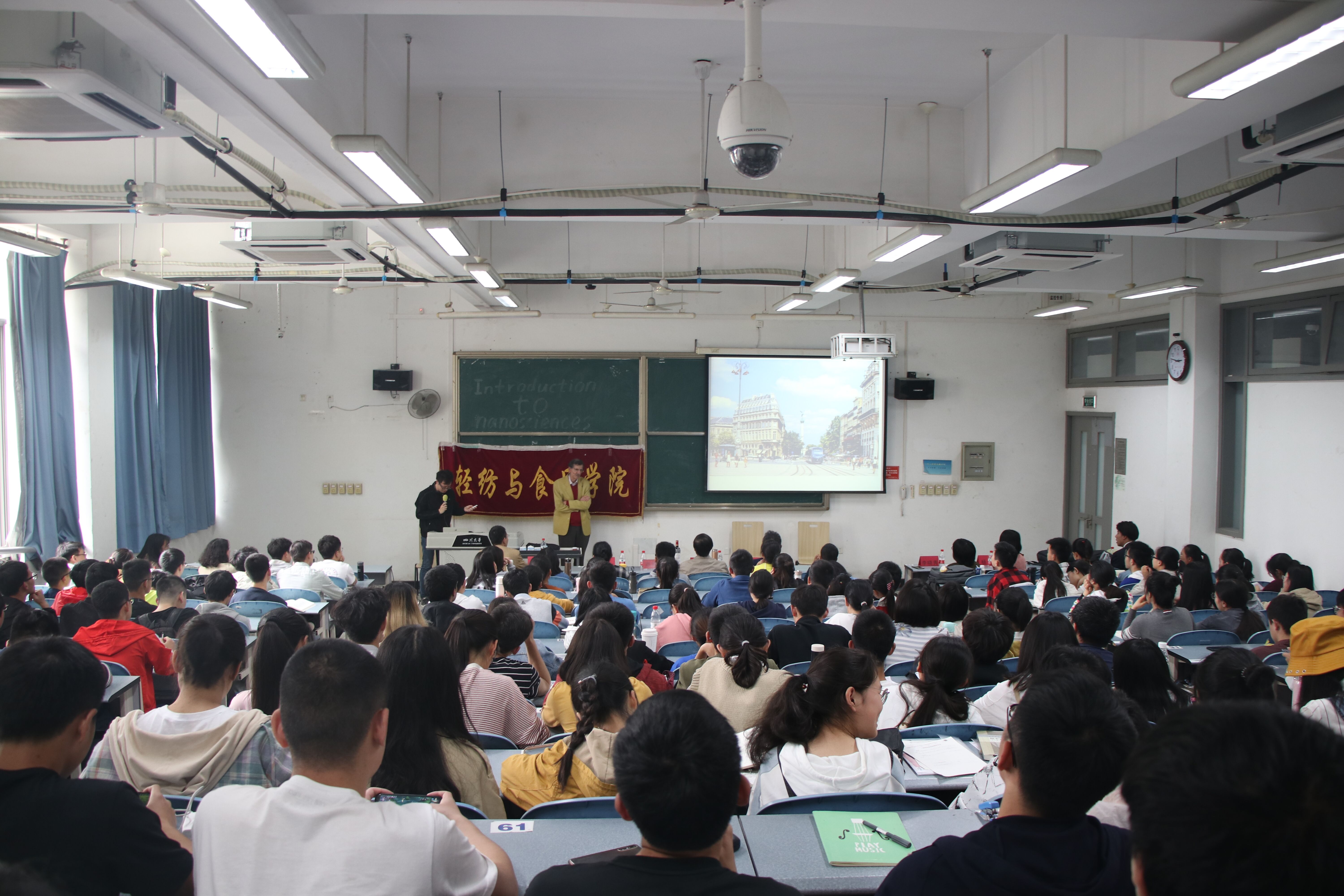 随后,教授通过世界顶尖学术杂志的介绍,强调纳米技术的重要性。Didier 院士在纳米技术研究领域具有非凡的造诣,清晰明了的介绍纳米材料的多种形式和各自的独特。在讲座中Didier 院士着重介绍金纳米粒子和其他纳米材料所不同的结构和广泛的应用。幽默生动的讲解,配上Didier 院士和善的笑容,大家对金纳米粒子有了深刻印象。此时,Didier 院士又为大家介绍了金纳米粒子的应用,在医学、生物和生活等方面的广泛的使用,详细的描述让大家沉迷。最后进行了提问环节,教授对同学们都关心的科研道路的问题进行多层次的对比分析,让大家心里对科研道路有了更深的认识。