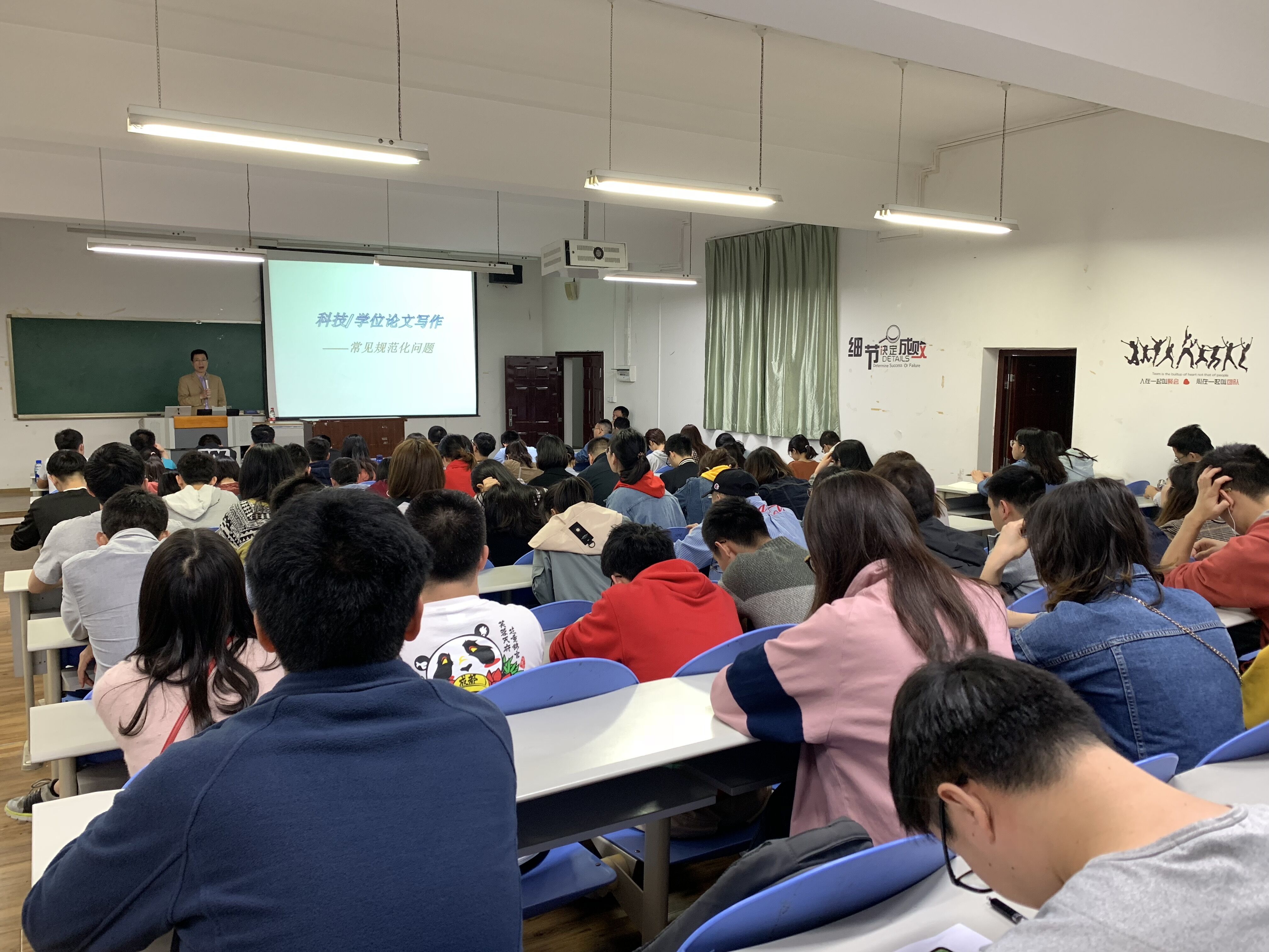 培训开始前,冯书记强调了研究生学术论文写作的重要性和高要求,是关系到研究生学术诚信与学术道德的重要方面,也是关系到研究生学位论文质量的重要因素。接着,单教授从学位论文所要求的严谨性、规范性等多角度向研究生们详细介绍了如何撰写一篇高水平学位论文和科技论文。从论文标题、署名、摘要、关键词、引言、本论、图表、结论、文献等方面,小到一个字符,大到文章结构的设计,从一个字的使用,到一句话的组织,面面俱到地进行了讲解。同时,单教授还通过列举平时写作中容易出现的错误点作为反面材料进行解析,针针见血,引得在场同学一阵热议。