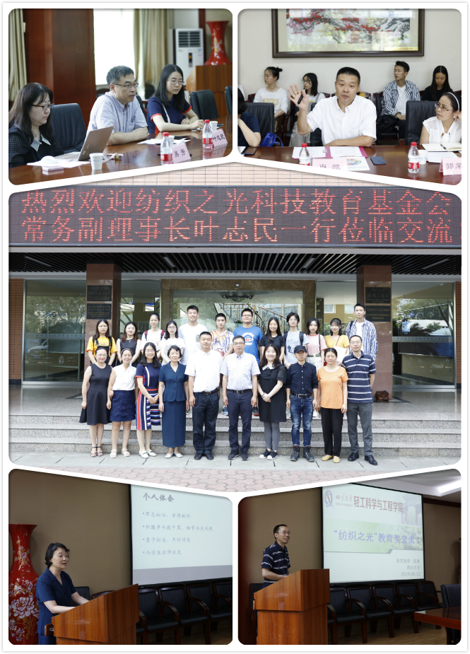 2019年6月12日,纺织之光教育科技基金会副理事长叶志民、中国纺织服装教育学会副秘书长白静、《中国纺织》杂志社新媒体部主任易芳赴bw必威西汉姆联官网对“纺织之光”中国纺织工业联合会教育奖项目进行回访考察。现场交流会在bw必威西汉姆联官网皮革楼会议室举行,学院肖凯副院长、系行政人员、近两年获奖师生等参会,由纺织与服装工程系主任郭荣辉主持。