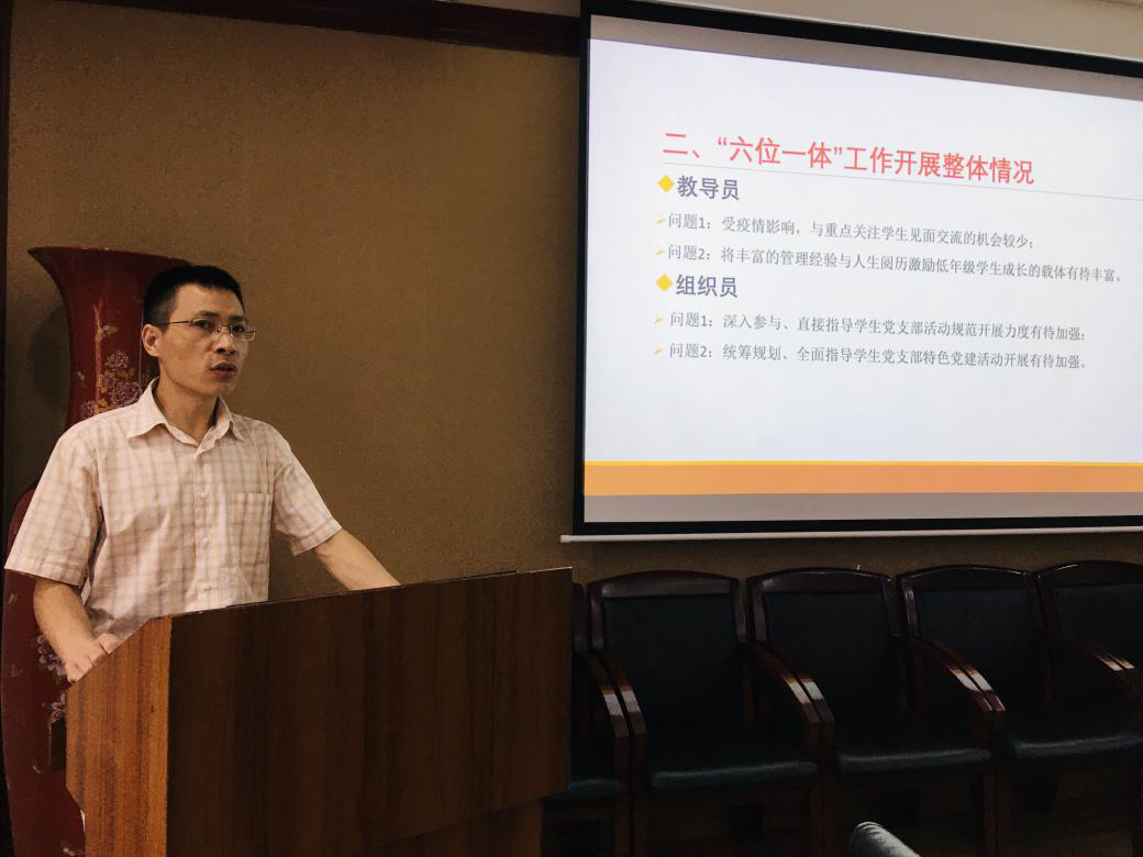 学院党委副书记冯国涛老师首先介绍“六位一体”思政工作队伍整体情况,学院长期坚持“全员育人、全程育人、全方位育人”办学理念,构建集“课程思政教师、辅导员、教导员、组织员、班主任、学术导师”六位一体的学生思想政治工作队伍,认真落实“立德树人”根本任务,共同促进学生的全面成长与成才。冯书记重点就工作开展中存在问题进行客观分析,感谢各位老师长期以来对学生工作的鼎力支持,希望共同携手、以生为本,全面落实“立德树人”的根本任务,加强学生的思想引领与学业发展指导,增强学生对学院专业的认同感、对学院文化的归属感,培养德智体美劳全面发展的高素质人才。
