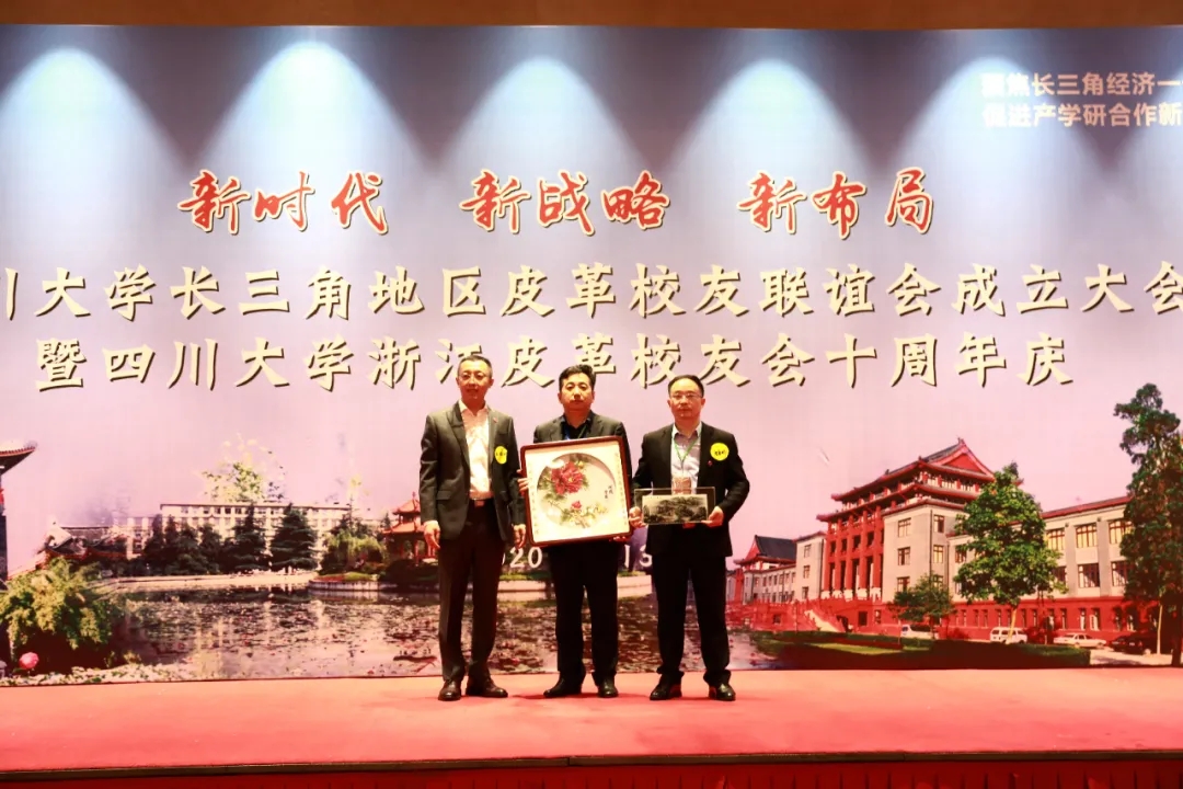 四川大学河北校友会会长孙晓刚代表河北校友会、河北皮革校友会向长三角皮革校友会赠送礼物