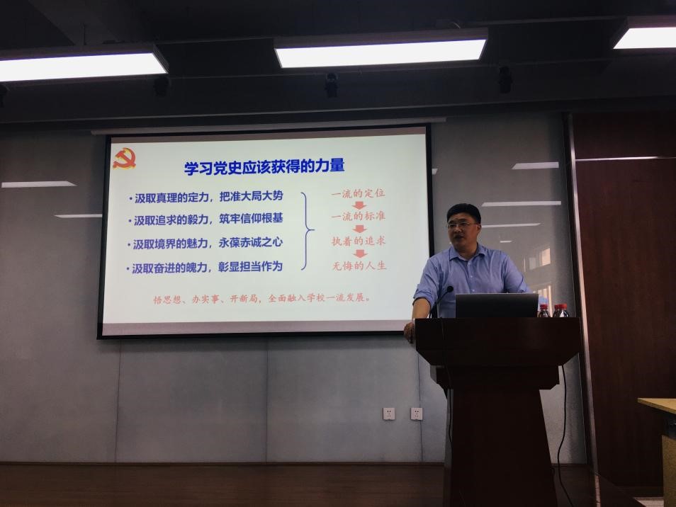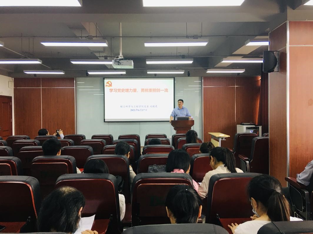 2021年6月17日下午,学院在皮革楼215报告厅召开全院教职工大会,举行党史学习教育专题党课暨“我为群众办实事”专题培训。学院党委刘晓虎书记讲授了《学习党史增力量,勇挑重担创一流》的专题党课,会议由何有节院长主持。