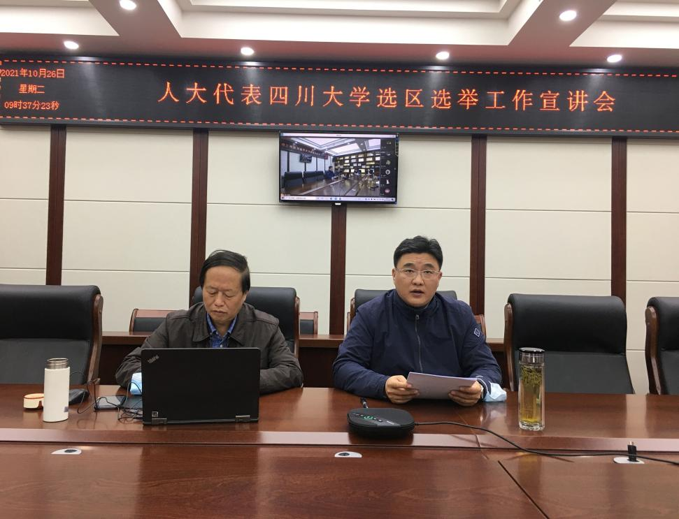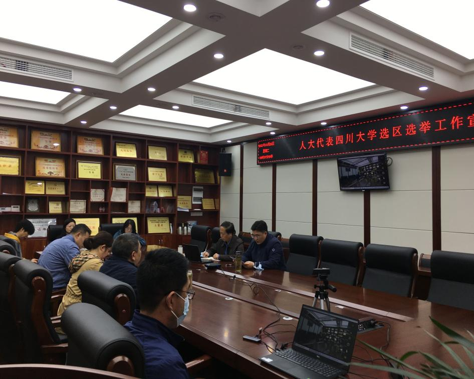 2021年10月26日,学院在纺工附楼205会议室举行武侯区第八届和双流区第十九届人大代表四川大学选区选举工作宣讲会。因疫情防控需要,本次会议采取线上线下相结合的方式进行,线下出席本次会议的有学院党委刘晓虎书记、何有节院长、党委冯国涛副书记以及教工党支部书记、选举工作组成员、部分教师代表。其余教师通过腾讯会议线上参会,本次会议由学院党委书记刘晓虎主持。