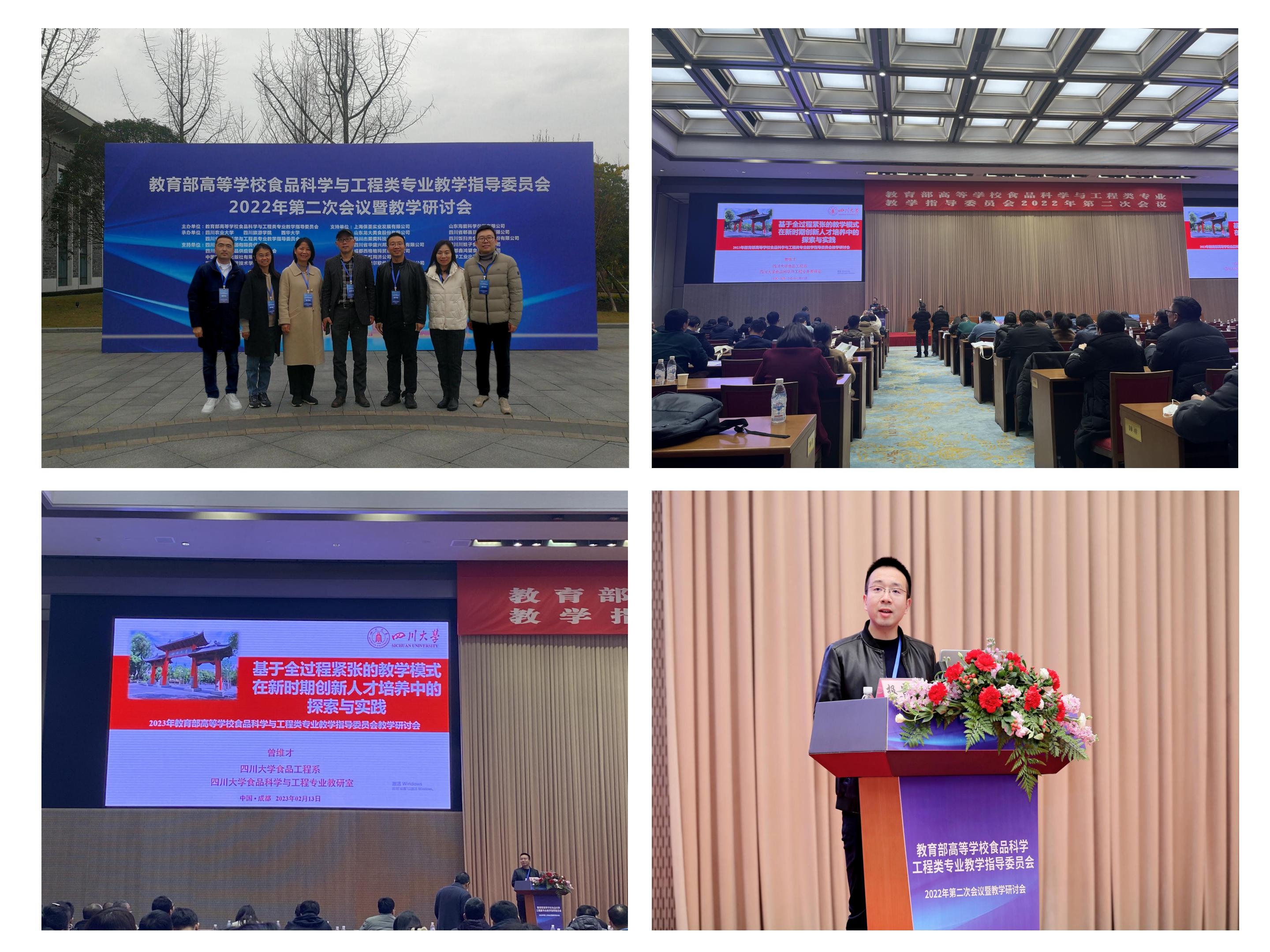 2023年2月13日,教育部高等学校食品科学与工程类专业教学指导委员会2022年第二次会议暨教学研讨会在成都召开。bw必威西汉姆联官网食品工程系何强、迟原龙、吕远平、曾维才、赵志峰、段飞霞和董怡等7位老师应邀出席大会,并就“新工科背景下食品专业本科教育的升级出发”及“食品科学与工程专业思政课程的建设”等主要议题积极参与大会的教学研讨。曾维才老师应邀做题为“基于全过程紧张的教学模式在新时期创新人才培养中的探索与实践”的大会交流报告。各位老师也与全国食品专业的各相关兄弟院校在创新人才培养、专业工程认证、创新创业教育体系的构建等方面进行了深入交流与探讨。