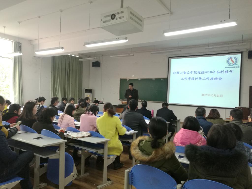2017年12月21日下午两点半,轻纺与食品学院迎接2018年本科教学工作审核评估工作启动会在纺工副楼205会议室召开。大会由教学副院长彭必雨教授主持,刘晓虎书记、何有节院长、冯国涛副书记、肖凯副院长和轻纺与食品学院全体教师参加了会议,傅师申教授作为特邀嘉宾也出席了此次会议。