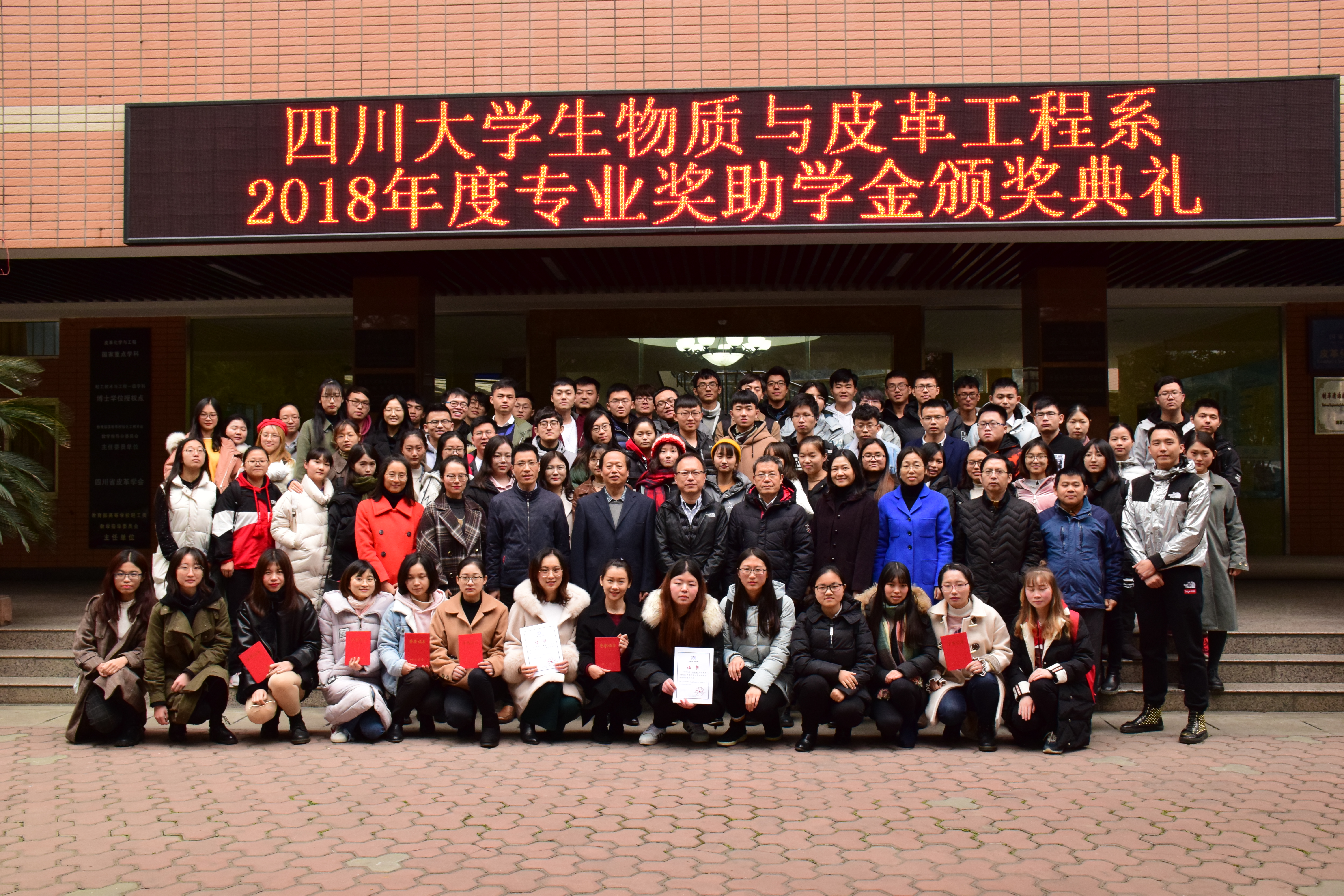 2018年12月7日,生物质与皮革工程系举办本科生奖学金颁奖典礼。中国皮革协会奖学金、斯塔尔奖学金、广州美多绿奖学金、欣驰奖助学金、广东皮革校友会热爱专业奖学金颁奖典礼在望江校区皮革楼报告厅隆重举行。