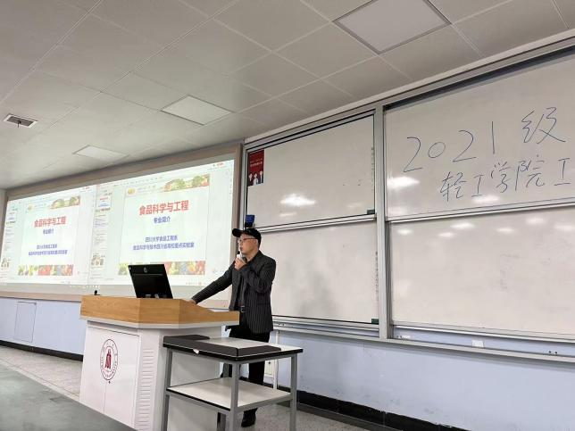 随后,何强教授对食品科学与工程专业进行了详细介绍。首先,何强教授提到食品科学与工程的内涵,引出生活中一系列食品领域相关问题,激发学生兴趣。其次,他介绍食品科学与工程专业、食品科学与工程核心知识体系以及学科专业优势亮点。再次,以食品工业在工业经济中地位、杰出校友代表取得显著成绩吸引学生对专业深层次认知,增强专业自信。最后,向低年级学生展示了往届师兄师姐在学科竞赛中获奖作品,鼓励同学们积极参加活动,将所学应用在生活实际中。