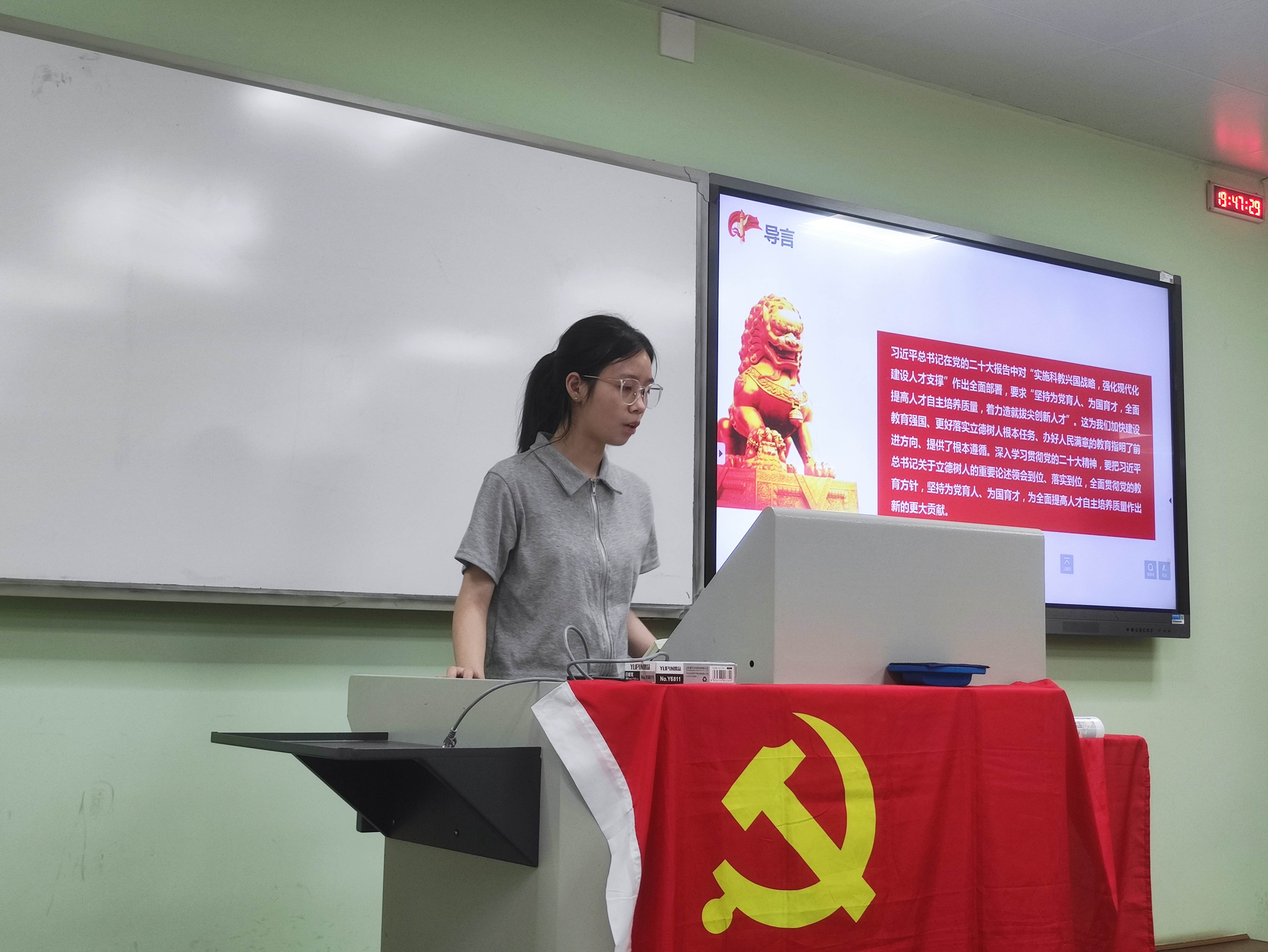 吕忱阳同志从高等教育的角度出发,全面介绍了习近平总书记对于教育、科技、人才的整体论述,尤其是在建设中国特色、世界一流大学的进程中,坚持立德树人根本任务,建立高水平人才培养体系的新理念新要求新任务。参会党员同学就如何成为一名德智体美劳全面发展的建设者和接班人开展了积极讨论。