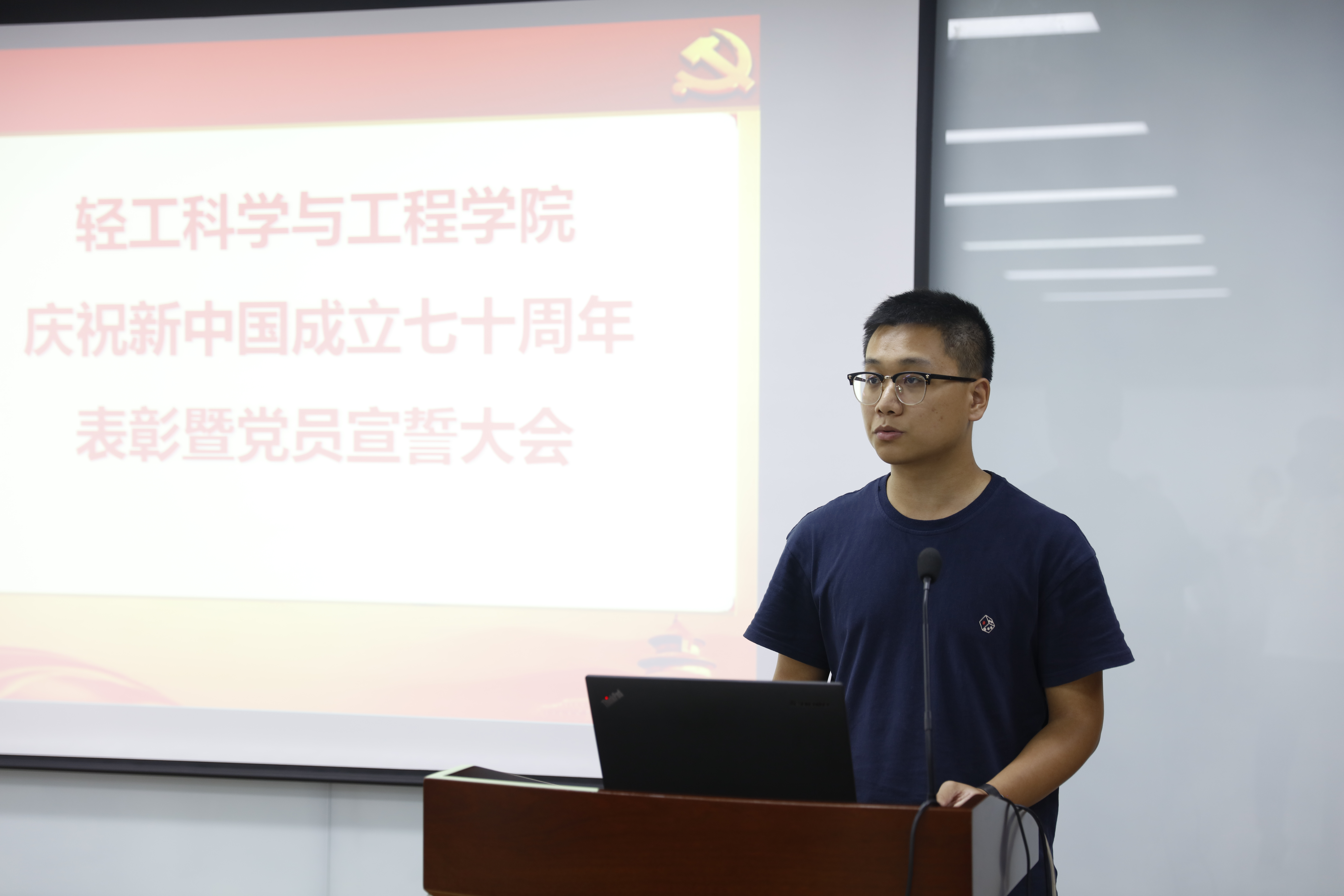 宣誓后,先进党支部-皮革教工支部支委陈玲同志上台发言,分享支部建设的经验和取得的成果;优秀学生党员代表郭浩从一名党员的标准谈及自身的发展,分享自己从一名普通学生到优秀共产党员的成长历程。