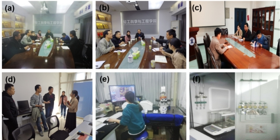 座谈及实地考察图片 (a-c)座谈,(d)沟通捷克TESCAN扫描电镜,(e)参观激光共聚焦荧光显微镜,(f)气路