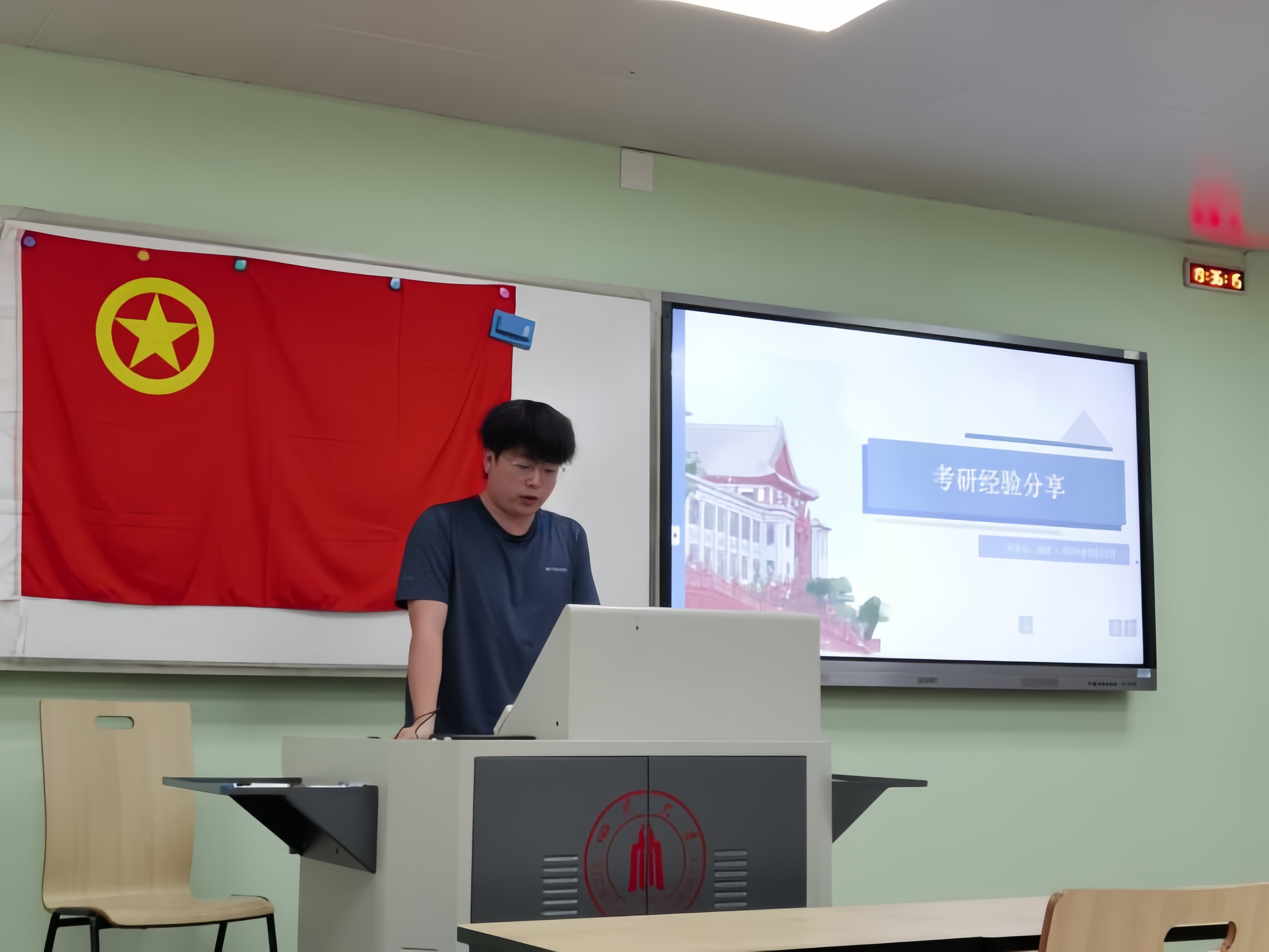 分享会上,卢高鑫和李帅浩同志分别分享了自己成功获得免试研究生资格的亲身经历,介绍了夏令营信息获取、申请渠道、材料准备等注意事项。卢高鑫同志指出,提前确定目标专业才能有的放矢的开展准备工作,希望同学们能将个人的理想追求融入党和国家事业之中,成长为担当民族复兴大任的时代新人。李帅浩同志着重分享了面试技巧,他激励大家多寻找机会提升自己,并寄语同学们不要因自己暂时的失败而放弃自己。“保研是一场持久战,不到最后一刻不要放弃。”
