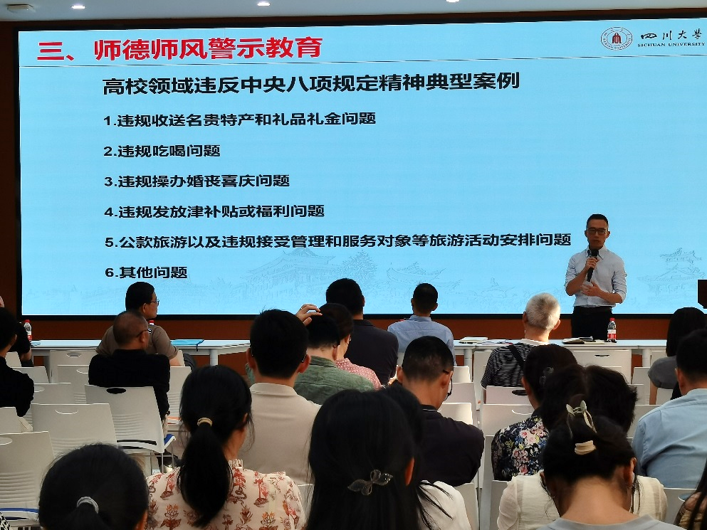 警示教育。学院党委副书记兼纪委书记姜新通过剖析高校领域违反中央八项规定精神的典型案例,让全体教职工从中得到警示、明晰行为边界、心存敬畏之心。
